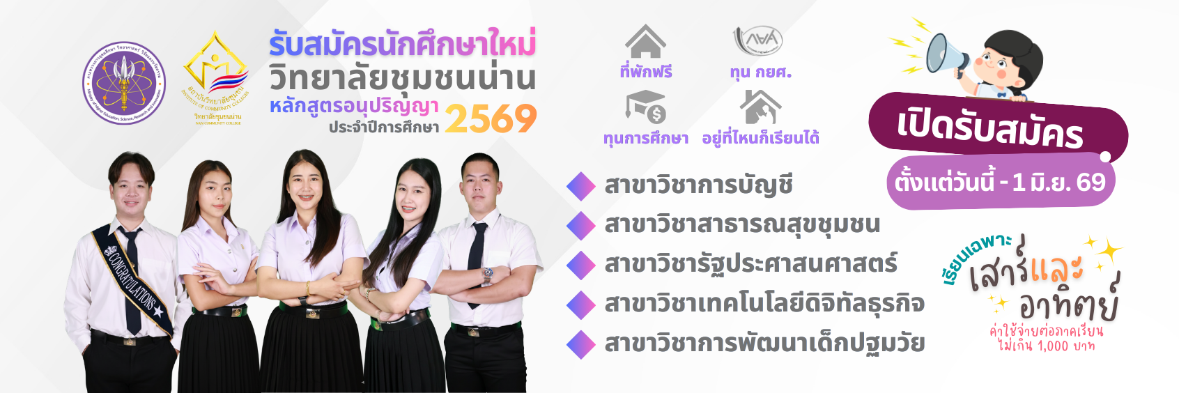 จำนวนผู้สมัครเรียนหลักสูตรอนุปริญญา ปี 2569 0 วิสัยทัศน์วิทยาลัยชุมชนน่าน ปลุกการเรียนรู้และพลังพหุปัญญาเพื่อความเข็มแข็งของชุมชน