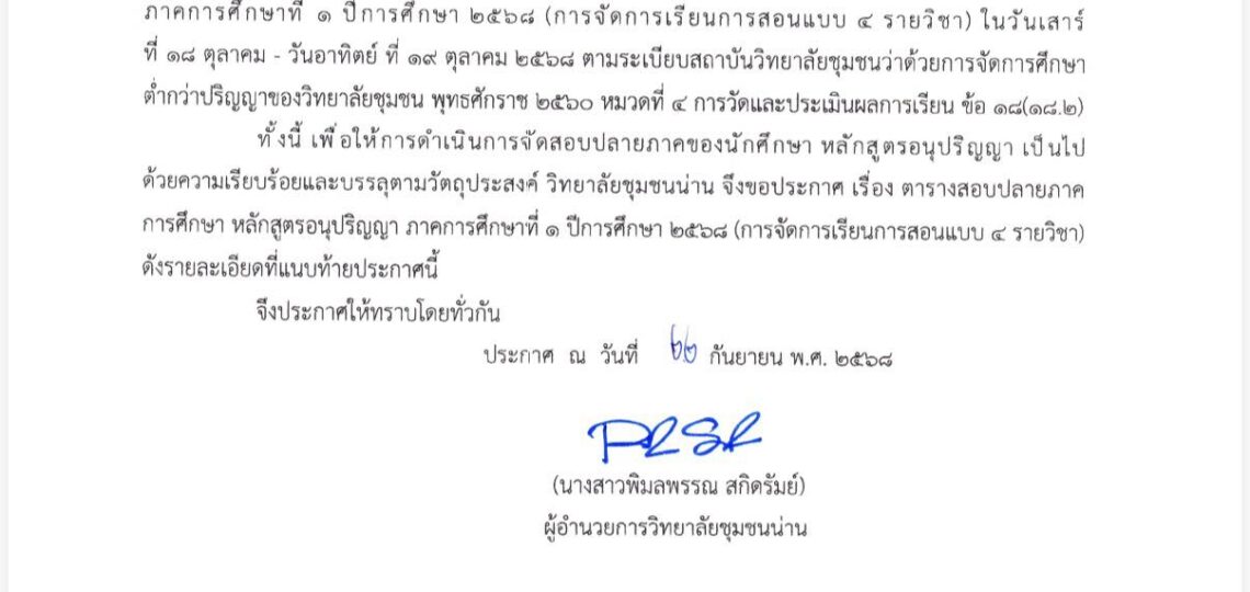 ประกาศวิทยาลัยชุมชนน่าน เรื่อง ตารางสอบปลายภาคการศึกษา หลักสูตรอนุปริญญาภาคการศึกษาที่ 1 ปีการศึกษา 2568 (การจัดการเรียนการสอนแบบ 4 รายวิชา)
