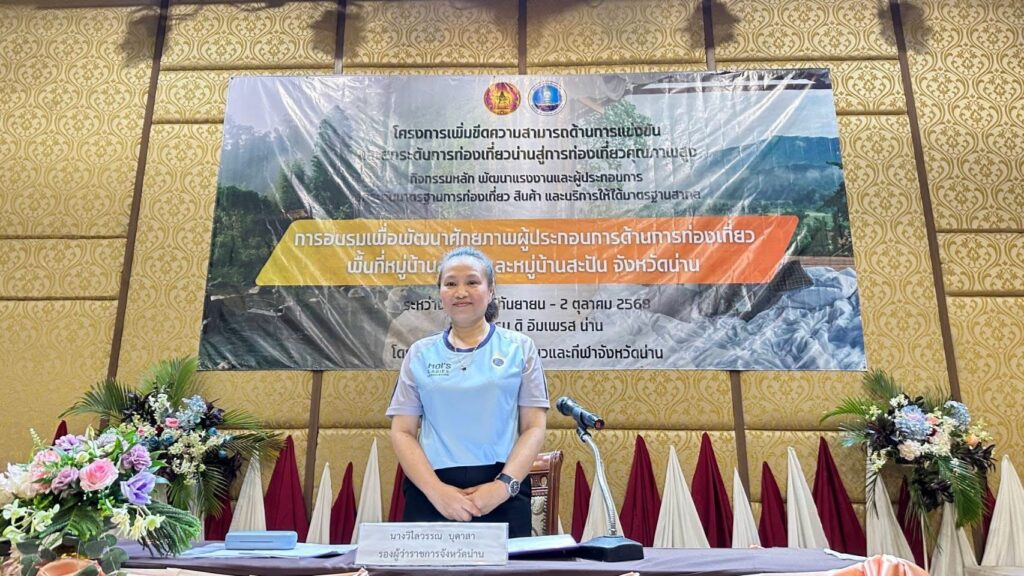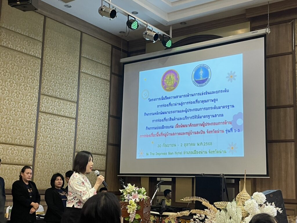 วันอังคารที่ 30 กันยายน 2568 เวลา 09.30 น. ดร.พิมลพรรณ สกิดรัมย์ ผู้อำนวยการวิทยาลัยชุมชนน่าน ร่วมเป็นเกียรติในพิธีเปิดการอบรมเพื่อพัฒนาศักยภาพผู้ประกอบการด้านการท่องเที่ยวพื้นที่หมู่บ้านสกาดและหมู่บ้านสะปัน จังหวัดน่าน ภายใต้โครงการเพิ่มขีดความสามารถด้านการแข่งขันและยกระดับการ ท่องเที่ยวน่านสู่การท่องเที่ยวคุณภาพสูง ประจำปีงประมาณ พ.ศ 2568 โดยมี นางวิไลวรรณ บุดาสา รองผู้ว่าราชการจังหวัดน่าน เป็นประธานในพิธีเปิดฯ ณ โรงแรมดิอิมเพลสน่าน อำเภอเมืองน่าน จังหวัดน่าน