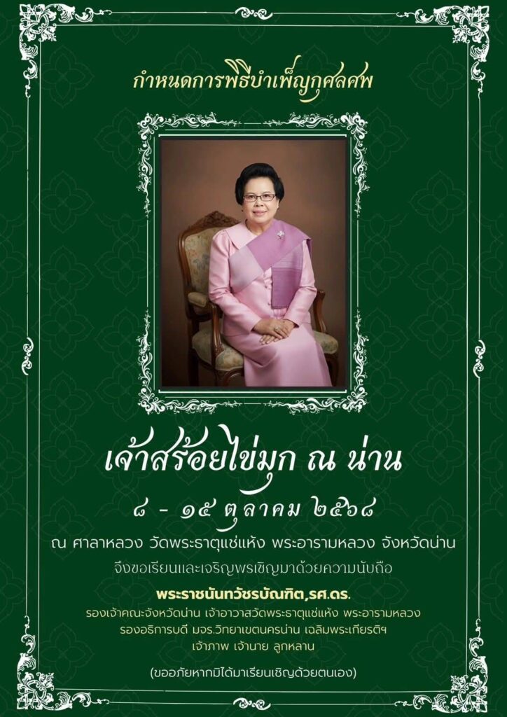 วันที่ 8 ตุลาคม 2568 ผู้บริหารและบุคลากรวิทยาลัยชุมชนน่าน เข้าร่วมประกอบพิธีพระราชทานน้ำหลวงอาบศพ เจ้าสร้อยไข่มุก ณ น่าน มารดา พระราชนันทวัชรบัณฑิต รองเจ้าคณะจังหวัดน่าน เจ้าอาวาสวัดพระธาตุแช่แห้ง พระอารามหลวง ณ ศาลาปฏิบัติธรรมเฉลิมพระเกียรติ (ศาลาหลวง) วัดพระธาตุแช่แห้ง พระอารามหลวง อำเภอภูเพียง จังหวัดน่าน