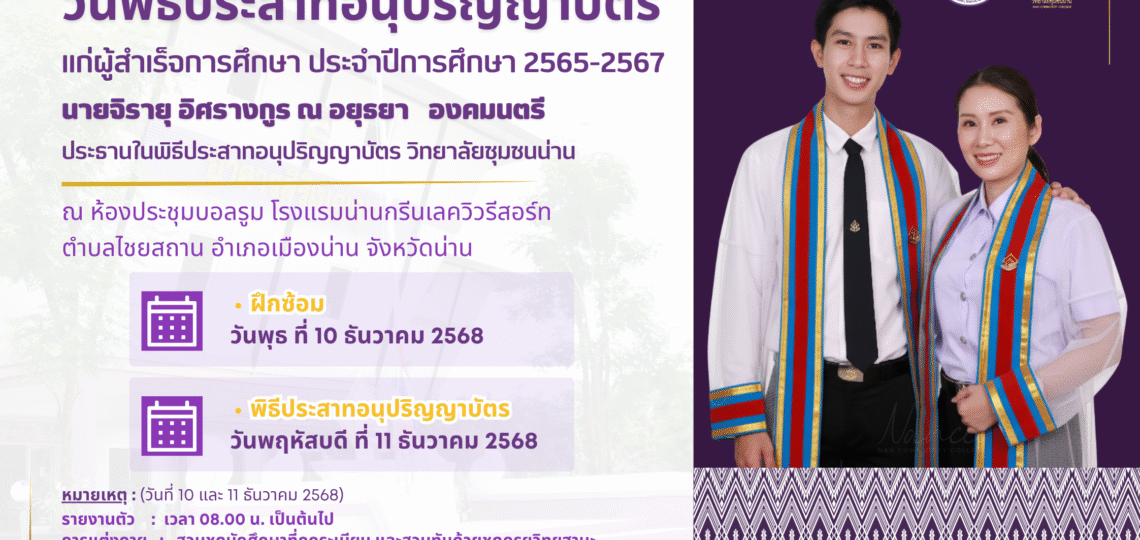 กำหนดการพิธีซ้อมและพิธีประสาทอนุปริญญาบัตร แก่ผู้สำเร็จการศึกษา ประจำปีการศึกษา 2565-2567 วิทยาลัยชุมชนน่าน โดย นายจิรายุ อิศรางกูร ณ อยุธยา องคมนตรี เป็นประธานในพิธี ระหว่างวันที่ 10 -11 ธันวาคม พ.ศ.2568 ณ ห้องประชุมบอลรูม โรงแรมน่านกรีนเลควิวรีสอร์ท ตำบลไชยสถาน อำเภอเมืองน่าน จังหวัดน่าน