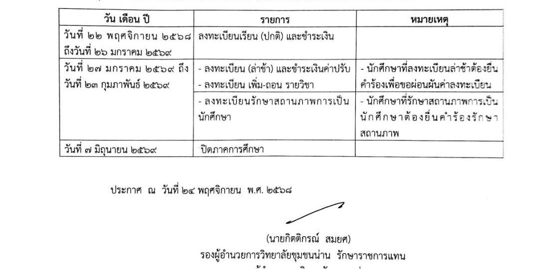ประกาศวิทยาลัยชุมชนน่าน เรื่อง การลงทะเบียน ระดับอนุปริญญา ภาคการศึกษาที่ 2 ปีการศึกษา 2568 ตั้งแต่วันที่ 22 พฤศจิกายน 2568 – วันที่ 26 มกราคม 2569 ตามประกาศที่แนบมาพร้อมนี้
