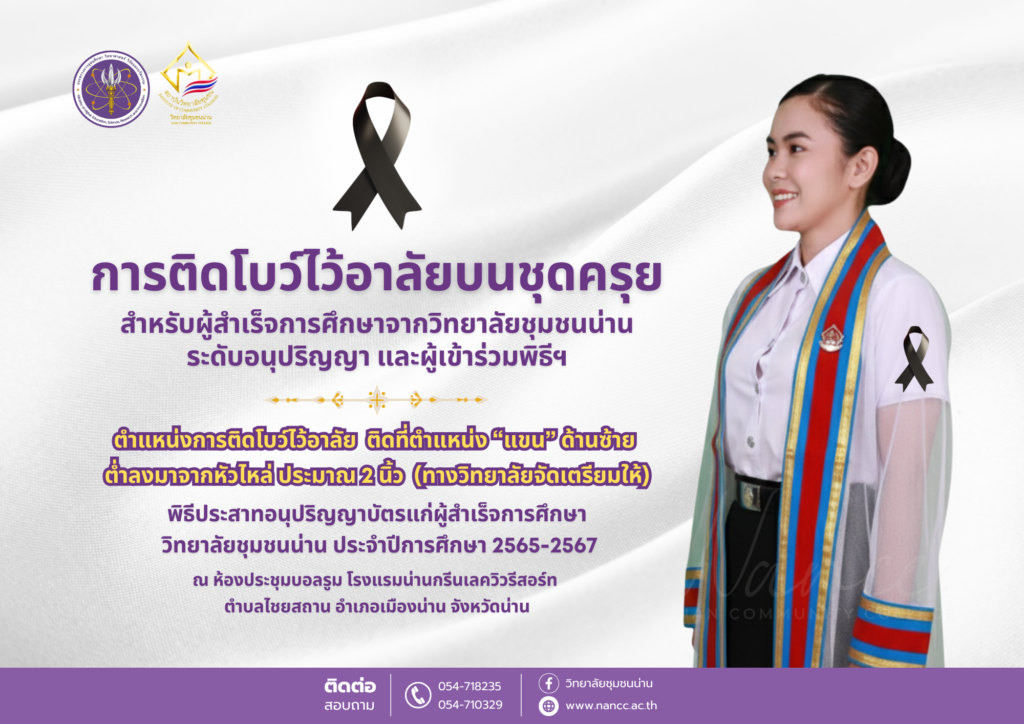 ประกาศวิทยาลัยชุมชนน่าน เรื่อง การติดโบว์ไว้อาลัยบนชุดครุยสำหรับผู้สำเร็จการศึกษาจากวิทยาลัยชุมชนน่านระดับอนุปริญญา และผู้เข้าร่วมพิธีฯ