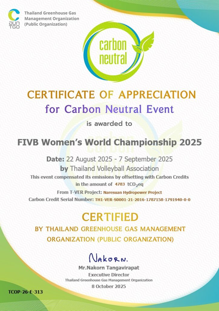 ❤️จากความมุ่งมั่นตั้งใจและความร่วมมือของทุกภาคส่วนทำให้เกิดผลสำเร็จเป็นรูปธรรม องค์การบริหารจัดการก๊าซเรือนกระจก ( องค์การมหาชน ) ได้ประกาศรับรองให้การจัดการแข่งขันครั้งนี้เป็น อีเว้นท์คาร์บอนนิวทรัล (Carbon Neutral Event) นับเป็นสมาคมกีฬาประเภทแรกและประเทศแรกของโลกที่ดำเนินการเรื่องนี้ได้สำเร็จ ซึ่งสหพันธ์วอลเลย์บอลนานาชาติจะใช้เป็นต้นแบบในการจัดการแข่งขันวอลเลย์บอลนานาชาติต่อไป นับเป็นอีกหนึ่งความภาคภูมิใจของคนไทยทั้งประเทศ