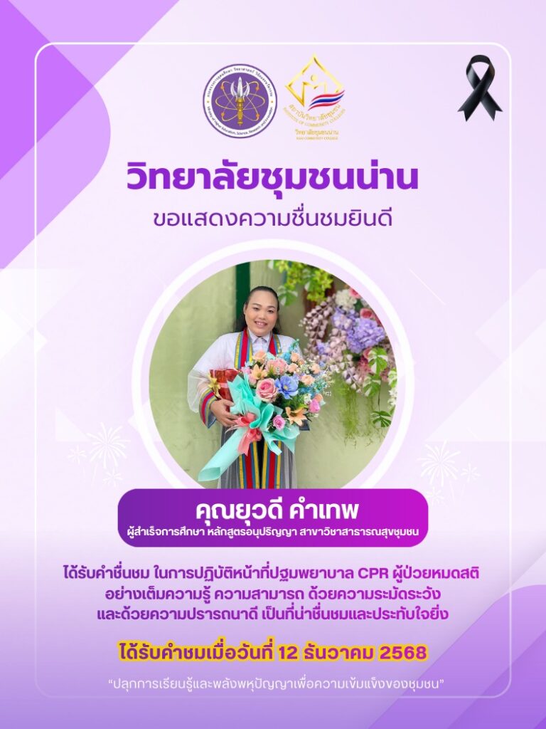 วิทยาลัยชุมชนน่าน ขอแสดงความชื่นชมยินดี คุณยุวดี คำเทพ ผู้สำเร็จการศึกษา หลักสูตรอนุปริญญา สาขาวิชาสาธารณสุขชุมชน ในการปฏิบัติหน้าที่ปฐมพยาบาล CPR ผู้ป่วยหมดสติ อย่างเต็มความรู้ ความสามารถฯ