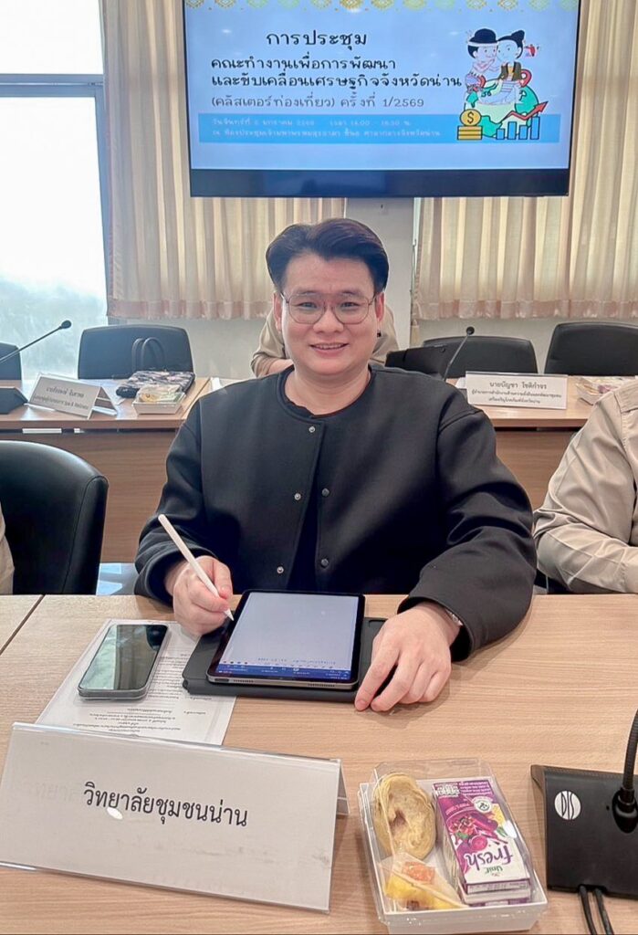 วันที่ 5 มกราคม 2569 ดร.พิมลพรรณ สกิดรัมย์ ผู้อำนวยการวิทยาลัยชุมชนน่าน มอบหมายให้ นายกิตติกรณ์ สมยศ รองผู้อำนวยการวิทยาลัยชุมชนน่าน เข้าร่วมประชุมคณะทำงานเพื่อการพัฒนาและขับเคลื่อนเศรษฐกิจจังหวัดน่าน (คลัสเตอร์ท่องเที่ยว) ณ ห้องประชุมเจ้ามหาพรหมสุรธาดา ชั้น 6 ศาลากลางจังหวัดน่าน