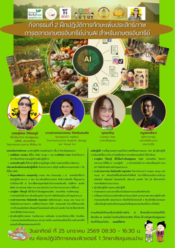 วิทยาลัยชุมชนน่านขอเชิญชวนผู้ที่สนใจ เข้าร่วมกิจกรรม “ฝึกปฏิบัติการทักษะเพิ่มประสิทธิภาพการตลาดเกษตรอินทรีย์น่าน AI สำหรับเกษตรอินทรีย์”