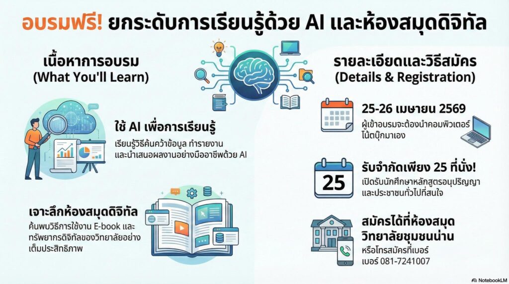 ห้องสมุดวิทยาลัยชุมชนน่าน ขอเชิญชวนทุกท่านเข้าร่วมอบรม ยกระดับการเรียนรู้สู่ยุคดิจิทัลด้วยการใช้ เทคโนโลยี AI ควบคู่กับ ห้องสมุดดิจิทัล เพื่อเพิ่มโอกาสในการเข้าถึงความรู้ สร้างทักษะการเรียนรู้ตลอดชีวิต และพัฒนาศักยภาพให้ทันต่อการเปลี่ยนแปลงของโลกยุคใหม่