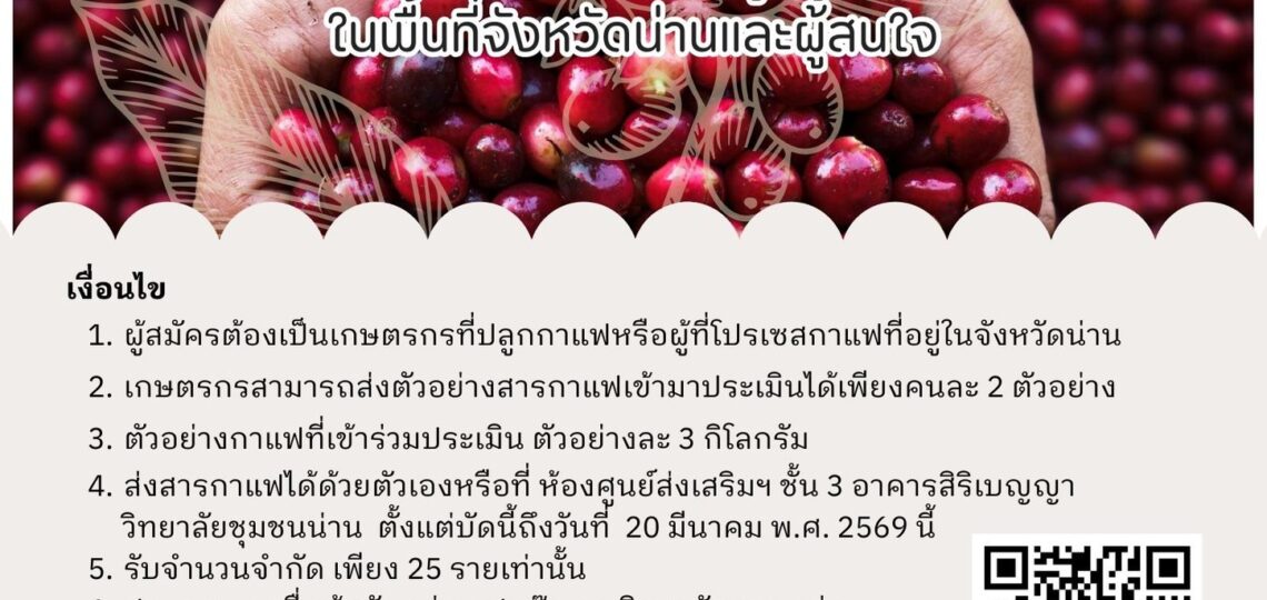 วิทยาลัยชุมชนน่าน เปิดรับสมัครเกษตรกรผู้ปลูกกาแฟในพื้นที่จังหวัดน่าน และผู้สนใจการประเมินคุณภาพเมล็ดกาแฟน่านตามมาตรฐานสากล