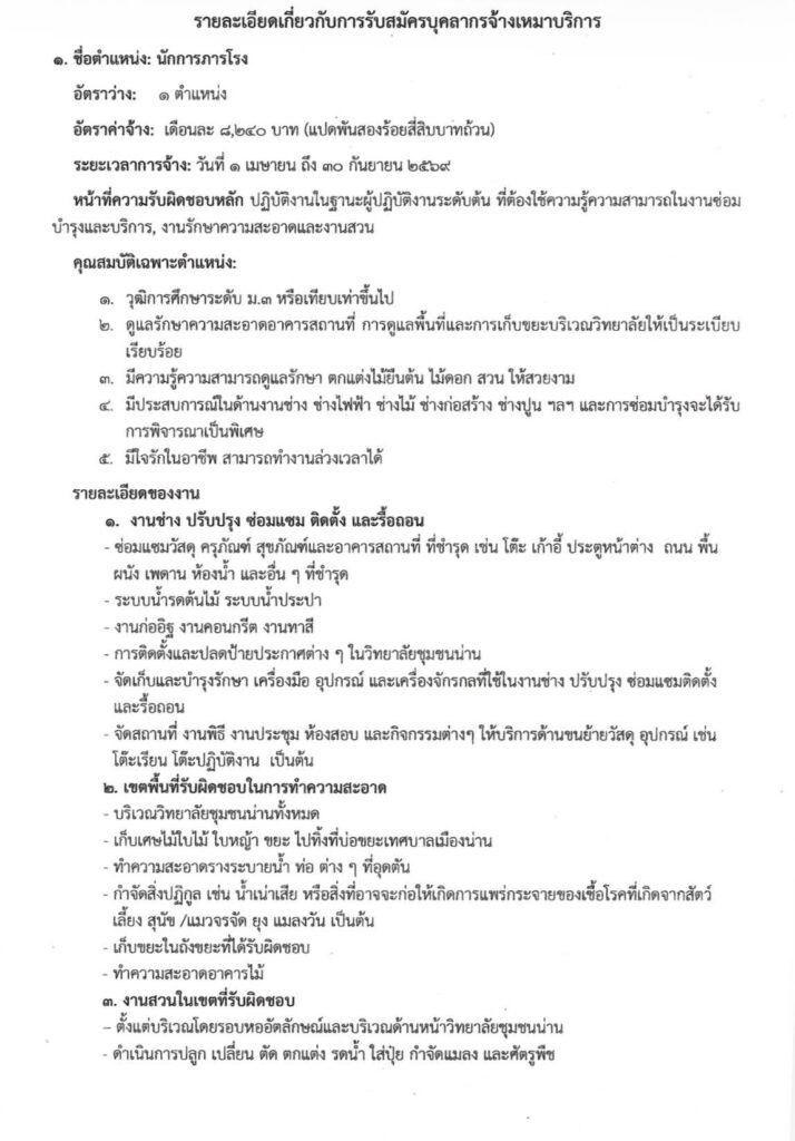 ประกาศวิทยาลัยชุมชนน่าน เรื่อง รับสมัครบุคคลเพื่อจ้างเหมาบริการ 1 ตำแหน่ง