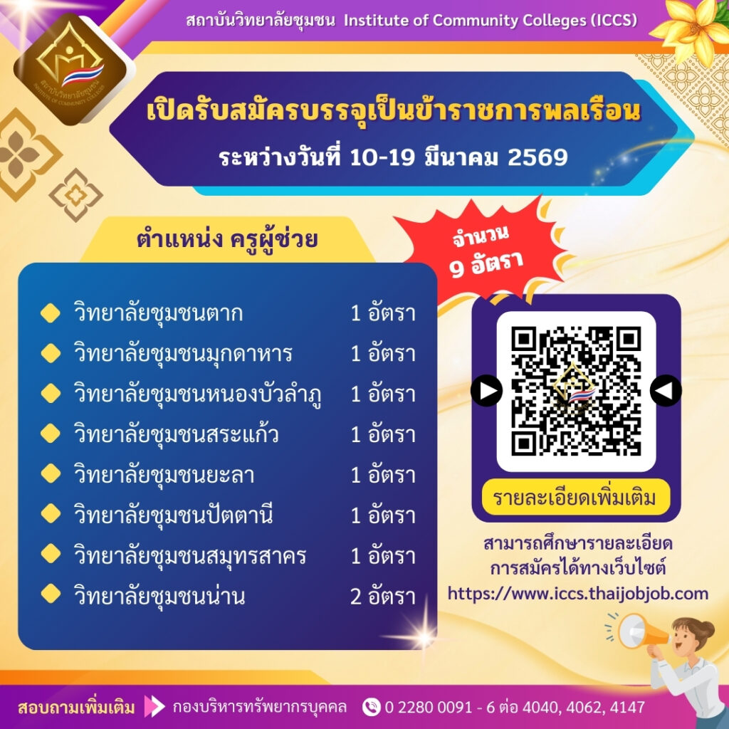 ประกาศสถาบันวิทยาลัยชุมชน เรื่อง การรับสมัครสอบแข่งขันเพื่อบรรจุและแต่งตั้งบุคคลเข้ารับราชการ ตำแหน่งครูผู้ช่วย จำนวน 9 อัตรา