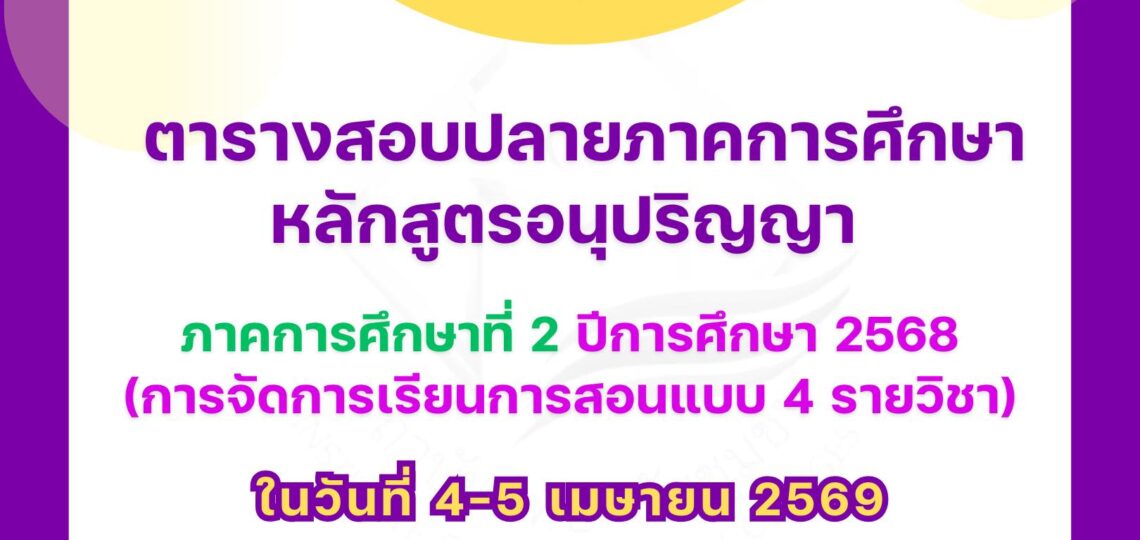 ประกาศวิทยาลัยชุมชนน่าน เรื่อง ตารางสอบปลายภาคการศึกษา หลักสูตรอนุปริญญา ภาคการศึกษาที่ 2 ปีการศึกษา 2568 (การจัดการเรียนการสอนแบบ 4 รายวิชา) https://drive.google.com/file/d/1FwapHnQ3KnQy-zo394ZQqc8tsPLLLNrD/view?usp=sharing