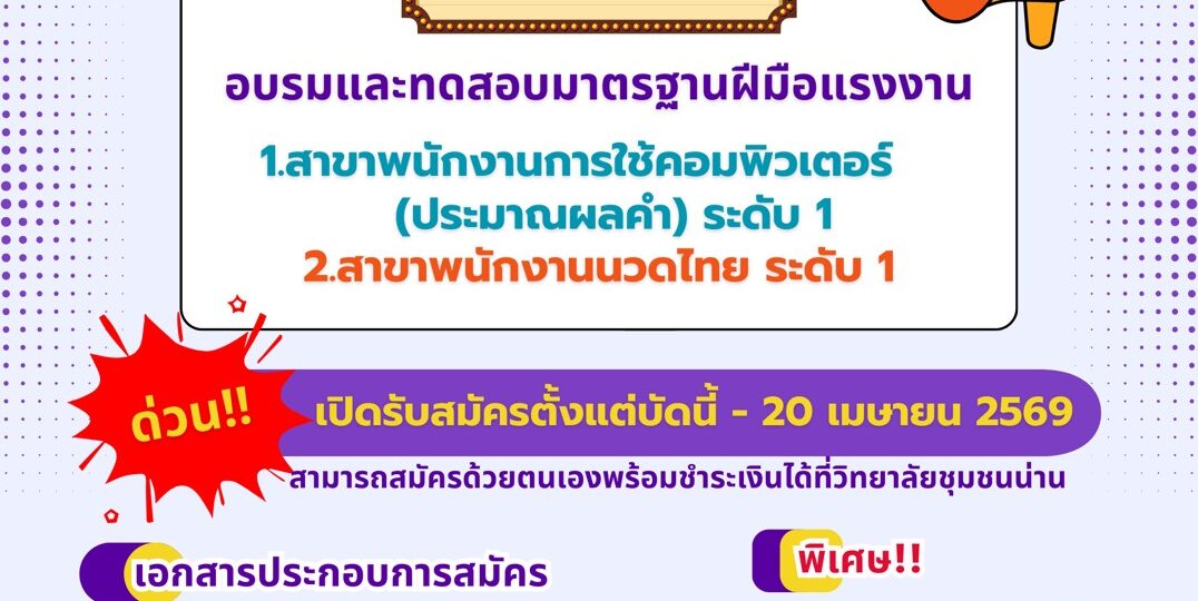 ศูนย์ทดสอบมาตรฐานฝีมือแรงงาน วิทยาลัยชุมชนน่านเปิดรับสมัคร อบรม+สอบมาตรฐานฝีมือแรงงานระดับชาติ ระดับ1 ตั้งแต่วันนี้ ถึง 20 เมษายน 2569*อบรมเตรียมความพร้อมและทดสอบมาตรฐานฝีมือแรงงาน1.สาขาพนักงานการใช้คอมพิวเตอร์ (ประมวลผลคำ) ระดับ 12.สาขาพนักงานนวดไทย ระดับ 1🔆พิเศษ ฟรี อาหารกลางวัน และเครื่องดื่ม ตลอดทั้ง 2 วันเงื่อนไขการสมัคร ท่านจะต้องเข้าร่วมทั้ง 2 วัน คือ📌ท่านสามารถมาสมัครด้วยตนเองพร้อมชำระเงินได้ที่วิทยาลัยชุมชนน่าน หรือ📍สมัครออนไลน์ ได้ที่ https://q.me-qr.com/dq46tm20☎️สอบถามข้อมูลเพิ่มเติมได้ที่วิทยาลัยชุมชนน่าน หรือ โทร. อ.ปิยะพล 0819986883 / อ.ณัฐกา 0898351266