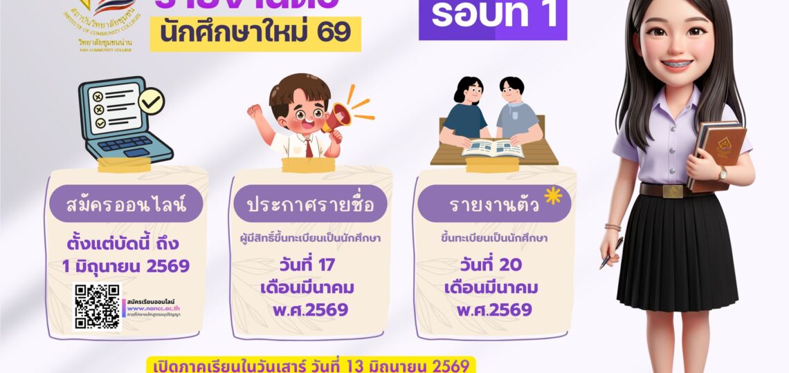 กำหนดการรายงานตัวนักศึกษาใหม่ ปีการศึกษา 2569🔔🔰 #รอบที่1📢 เปิดรับสมัครแล้ววันนี้🔰เปิดรับสมัครตั้งแต่บัดนี้ จนถึง 1 มิถุนายน 2569💛 5 สาขาวิชา🟣สาขาวิชาการบัญชี🟢สาขาวิชาการพัฒนาเด็กปฐมวัย🔵สาขาวิชาสาธารณสุขชุมชน🔴สาขาวิชารัฐประศาสนศาสตร์🟡สาขาวิชาเทคโนโลยีดิจิทัลธุรกิจ📌สามารถสมัครออนไลน์ได้ที่ https://forms.gle/YxGJRQFUF6ckx18H9หรือสมัครได้ที่วิทยาลัยชุมชนน่าน ได้ทุกวัน ตั้งแต่เวลา 8.30 น. – 16.30 น.☎สอบถามรายละเอียดเพิ่มเติม Line @ : https://lin.ee/UhuJKIbหรือ โทร. 054710329 , 054718235
