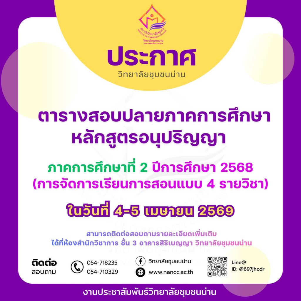 ประกาศวิทยาลัยชุมชนน่าน เรื่อง ตารางสอบปลายภาคการศึกษา หลักสูตรอนุปริญญา ภาคการศึกษาที่ 2 ปีการศึกษา 2568 (การจัดการเรียนการสอนแบบ 4 รายวิชา)