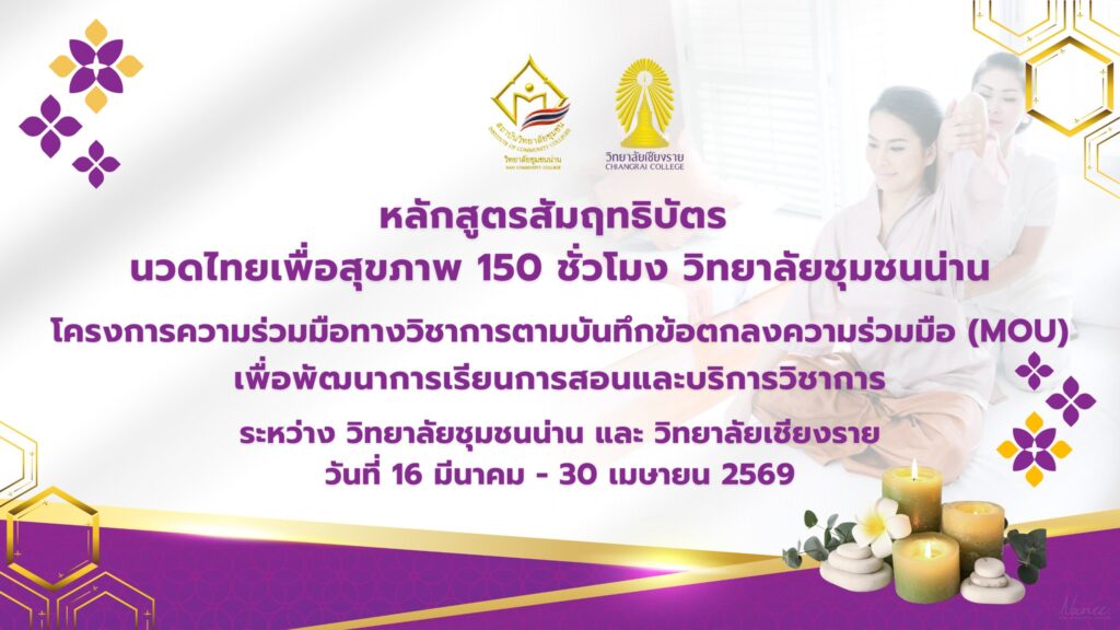 วิทยาลัยชุมชนน่านจัดการเรียนการสอนหลักสูตรสัมฤทธิบัตรนวดไทยเพื่อสุขภาพ 150 ชั่วโมง ณ วิทยาลัยเชียงราย ภายใต้ความร่วมมือทางวิชาการตามบันทึกข้อตกลงความร่วมมือ (MOU) เพื่อพัฒนาการเรียนการสอนและบริการวิชาการ ระหว่าง วิทยาลัยชุมชนน่าน และ วิทยาลัยเชียงราย