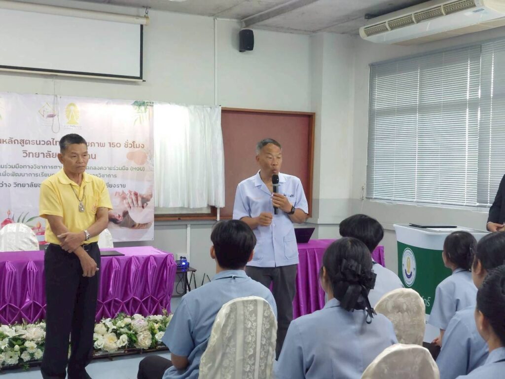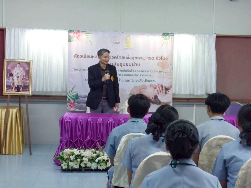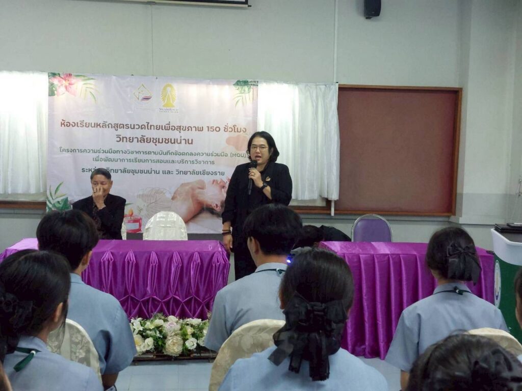 วันที่ 16 มีนาคม 2569 วิทยาลัยชุมชนน่าน เปิดห้องเรียนหลักสูตรสัมฤทธิบัตรนวดไทยเพื่อสุขภาพ 150 ชั่วโมง ณ วิทยาลัยเชียงราย จังหวัดเชียงราย รุ่นที่ 1