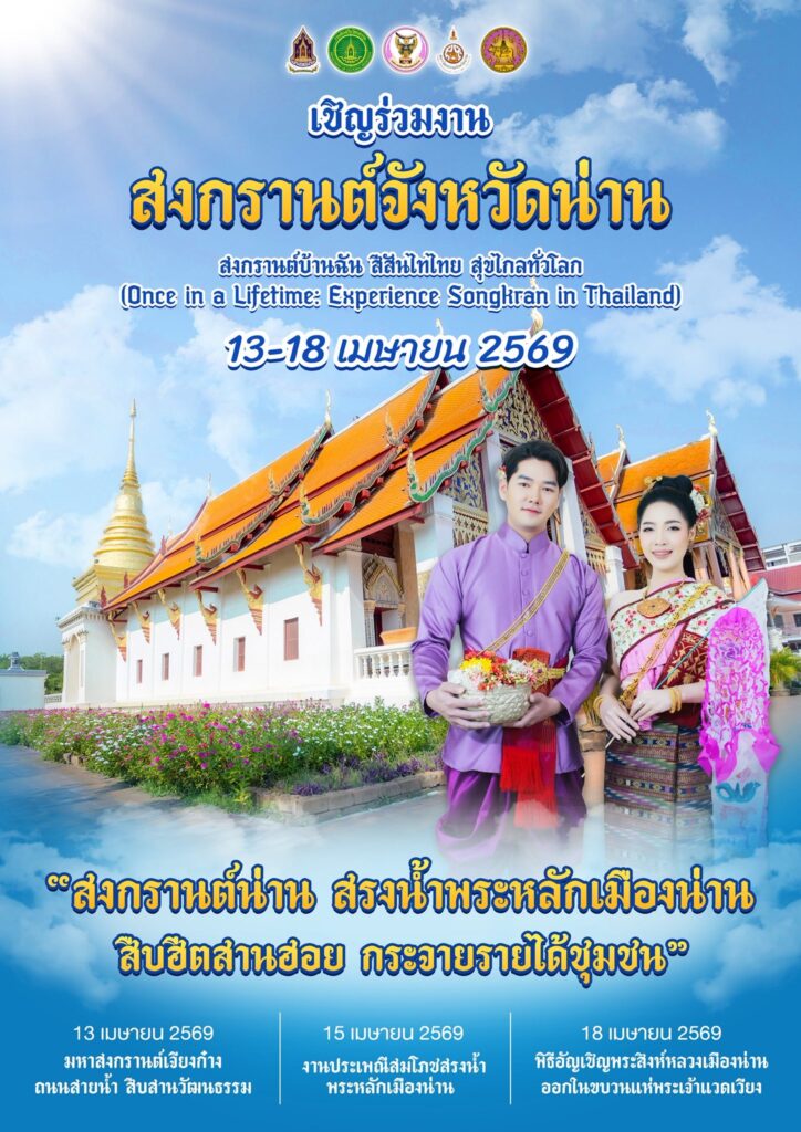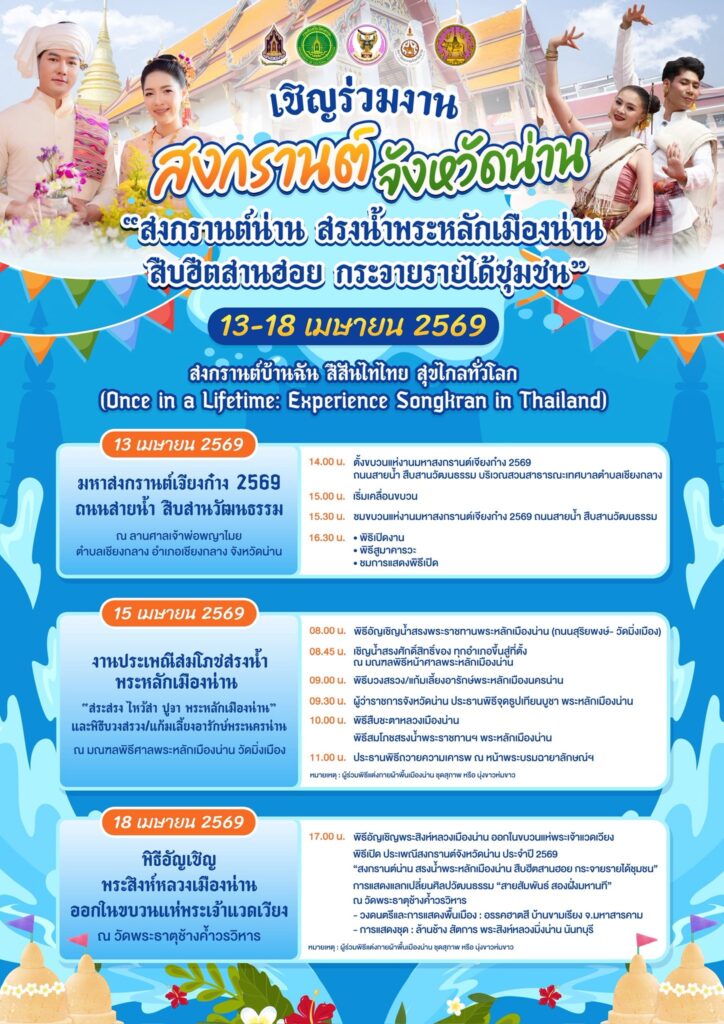 สภาวัฒนธรรมจังหวัดน่านร่วมกับองค์การบริหารส่วนจังหวัดน่าน ขอเชิญร่วมงาน “สงกรานต์น่าน สรงน้ำพระหลักเมืองน่าน แห่พระเจ้าแวดเวียง สืบฮีต สานฮอย กระจายรายได้ชุมชน” งานประเพณีสงกรานต์จังหวัดน่าน ประจำปี พ.ศ. 2569