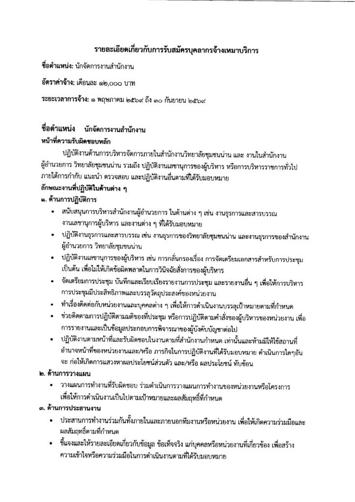 ประกาศวิทยาลัยชุมชนน่าน เรื่อง รับสมัครบุคคลเพื่อจ้างเหมาบริการ ตำแหน่ง นักจัดการงานสำนักงาน จำนวน 1 อัตรา