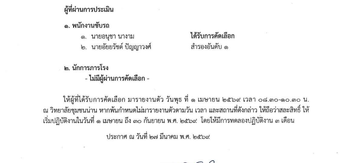 ประกาศรายชื่อผู้ผ่านการคัดเลือกเพื่อจ้างเหมาบริการ #ตำแหน่งพนักงานขับรถ นายอนุชา นางาม #ตำแหน่งนักการโรง – ไม่มีผู้ผ่านการคัดเลือก – ให้ผู้ที่ผ่านการคัดเลือกมารายงานตัวในวันพุธ ที่ 1 เมษายน 2569 ณ ห้องประชุมสิริเบญญา 3 ตั้งแต่เวลา 08.30-10.30 น. เป็นต้นไป
