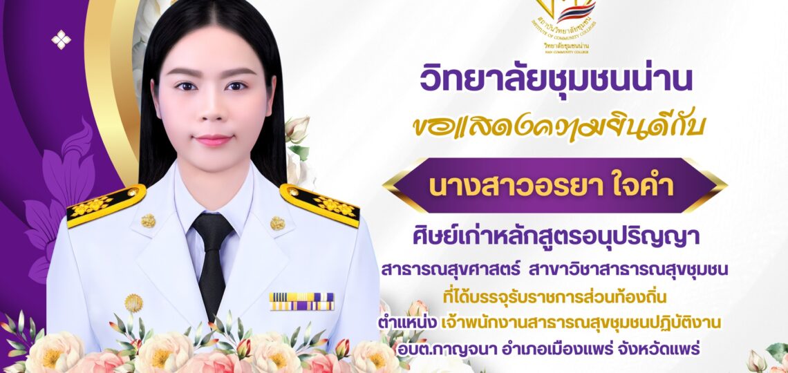 วิทยาลัยชุมชนน่าน ขอแสดงความยินดีกับ นางสาวอรยา ใจคำ ศิษย์เก่าหลักสูตรอนุปริญญา สาธารณสุขศาสตร์ สาขาวิชาสาธารณสุขชุมชน ที่ได้บรรจุรับราชการส่วนท้องถิ่น ตำแหน่ง เจ้าพนักงานสาธารณสุขชุมชนปฏิบัติงาน อบต.กาญจนา อำเภอเมืองแพร่ จังหวัดแพร่