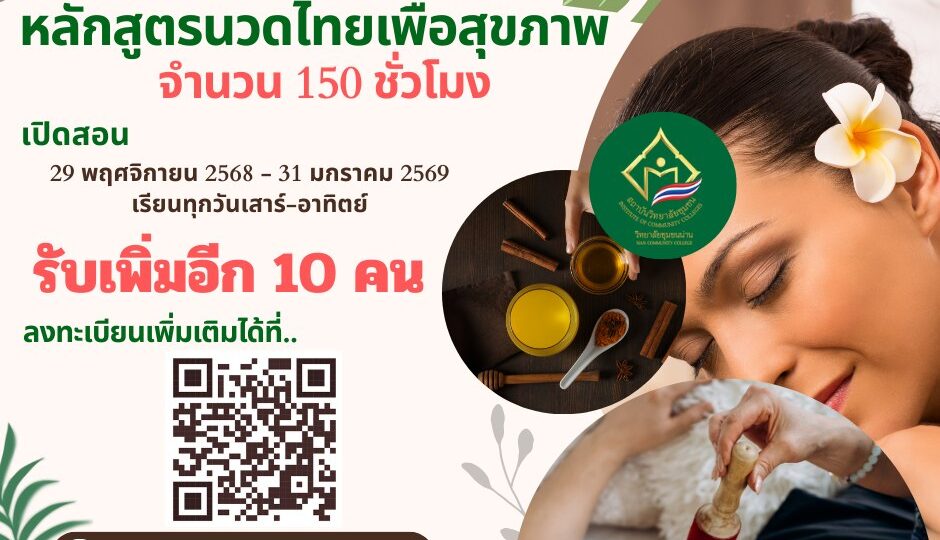 วิทยาลัยชุมชนน่าน รับสมัครผู้ที่สนใจเรียนหลักสูตรนวดไทยเพื่อสุขภาพ 150 ชั่วโมง เพิ่มจำนวน 10 คนด่วน!! รับเพิ่มอีก 10 คนค่ะ 🎯🎯🔆หลักสูตรนวดไทยเพื่อสุขภาพ 150 ชั่วโมง🔆เปิดเรียนในวันที่ 29 พฤศจิกายน 2568 – 31 มกราคม 2569📍สนใจสมัครเพิ่มเติมได้ที่: https://docs.google.com/…/1FAIpQLSfZzWr5OELnJ6…/viewform☎️สอบถามเพิ่มเติมได้ที่:วิทยาลัยชุมชนน่าน 054-710329อ.ปลา 087-1750104