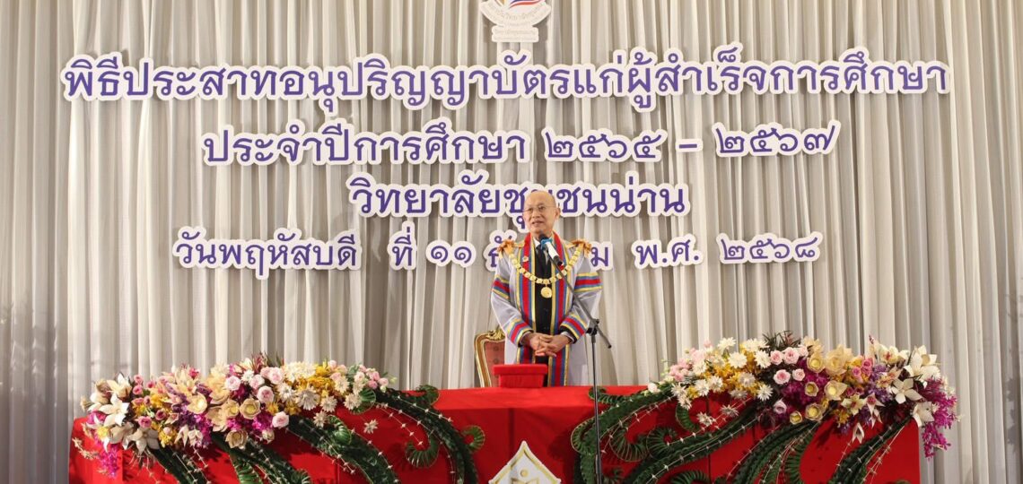 องคมนตรีเป็นประธาน ในพิธีประสาทอนุปริญญาบัตรแก่ผู้สำเร็จการศึกษาวิทยาลัยชุมชนน่าน วันพฤหัสบดีที่ 11 ธันวาคม พ.ศ. 2568 เวลา 10.00 น. ที่ ห้องประชุมน่านกรีนเลควิวรีสอร์ท ตำบลไชยสถาน อำเภอเมืองน่าน จังหวัดน่าน ศาสตราจารย์เกียรติคุณนายแพทย์เกษม วัฒนชัย องคมนตรีมาเป็นประธานในพิธีประสาทอนุปริญญาบัตร แก่ผู้สำเร็จการศึกษาวิทยาลัยชุนชนน่าน ประจำปีการศึกษา 2565 – 2567 โดยมีผู้สำเร็จการศึกษาเข้ารับใบอนุปริญาบัตรหลักสูตรอนุปริญญาบัตร จำนวน 112 คน ในสาขาวิชาการท่องเที่ยว สาขาวิชารัฐประศาสนศาสตร์ สาขาวิชาสาธารณสุขชุมชน สาขาวิชาการบัญชี สาขาวิชาการศึกษาปฐมวัย สาขาวิชาคอมพิวเตอร์ธุรกิจ และเทคโนโลยีดิจิทัลธุรกิจ ทั้งนี้สภาวิทยาลัยชุมชนน่านมอบโล่เชิดชูเกียรติ ให้แก่ผู้มีอุปการคุณต่อวิทยาลัยชุมชนน่าน จำนวน 9 ราย มอบเกียรติบัตรเชิดชูเกียรติ จำนวน 2 แห่ง ได้แก่องค์การบริหารส่วนจังหวัดน่าน และสำนักงานพื้นที่พิเศษเพื่อการท่องเที่ยวอย่างยั่งยืนเมืองเก่าน่าน…