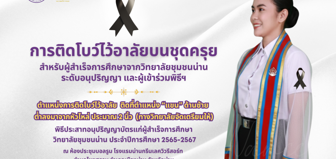 ประกาศวิทยาลัยชุมชนน่าน เรื่อง การติดโบว์ไว้อาลัยบนชุดครุยสำหรับผู้สำเร็จการศึกษาจากวิทยาลัยชุมชนน่านระดับอนุปริญญา และผู้เข้าร่วมพิธีฯ
